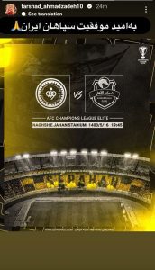 حالا فرشاد احمدزاده با انتشار پوستر بازی سپاهان و شباب الاهلی در پلی آف لیگ نخبگان برای تیم سابقش آرزوی موفقیت کرد.